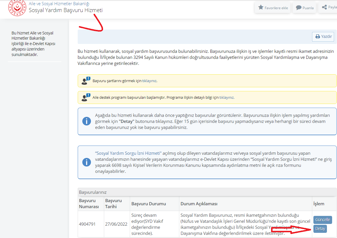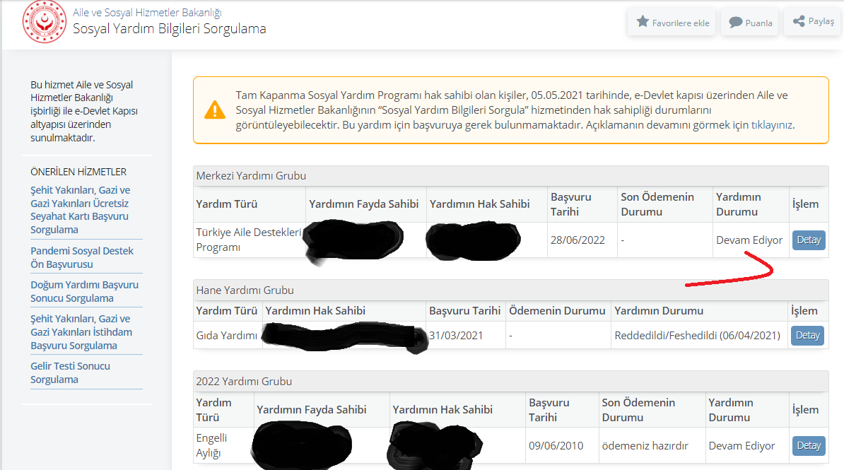 Sosyal yardım bilgilerinde Yardımın Durumu kısmında yer alan devam ediyor ibaresi başvurunun onaylandığı anlamına geliyor.