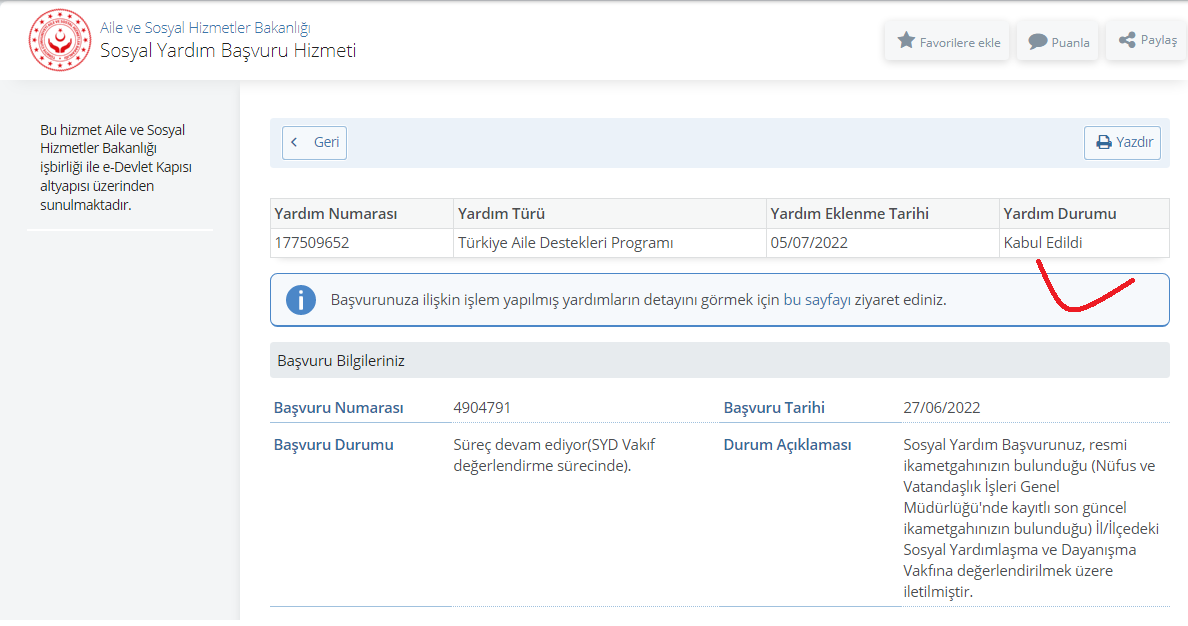 Sosyal Yardım Başvuru Hizmetinden Detay Bölümüne Tıkladığınızda. Yardımın Durumu kısmında Kabul Edildi ibaresini göreceksiniz.